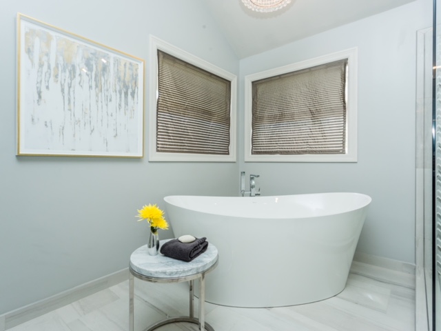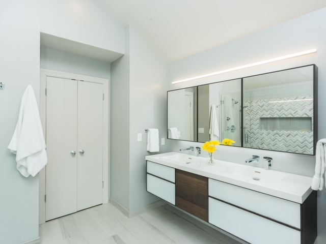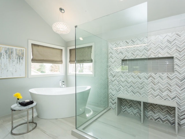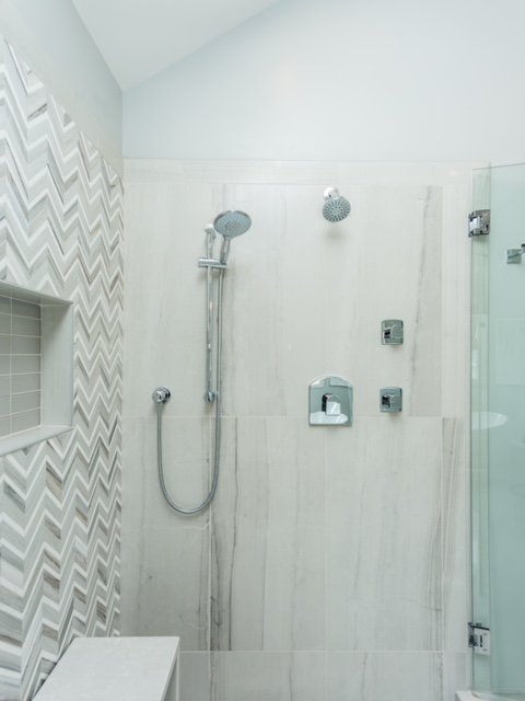 Utilizing classic neutrals with clean crisp whites, we created a timeless and sophisticated look, complete with a modern glass and herringbone walk-in shower. With porcelain and marble accents mixed throughout, the renovation will provide its owners with a modern aesthetic that will endure for years to come.